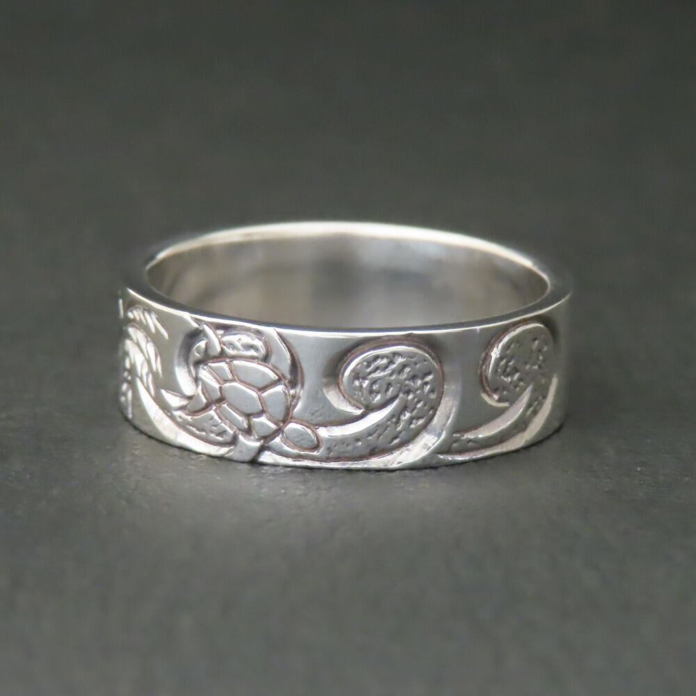 ハワイアンジュエリー リング 指輪 黒 海亀 ヤシの木 波 シルバー925 【刻印無料】 ホヌ ウミガメ スクロール 波模様 椰子の木 パームツリー シルバーアクセサリー メンズ ユニセックス ペアリング 誕生日 プレゼント ジュエリーボックス Grand Galleria グランドガレリア